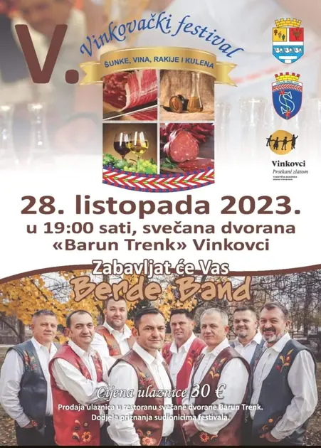 V. Festival šunke, vina, rakije i kulena održat će se 28. listopada 2023. u 19 sati u svečanoj dvorani "Barun Trenk" u Vinkovcima. Manifestacija koja u prvi plan stavlja gastro specijalitete ovog kraja, objedinjuje sve ono najbolje što u gastronomiji i enologiji Slavonija nudi.
