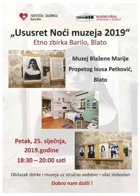 Zbog toga Etno kuća Barilo, Muzej Blažene Marije Propetog Isusa Petković, Blatski fižuli ustanova u kulturi i Turistička zajednica općine Blato organiziraju razgled zbirke i muzeja uz stručno vodstvo pod nazivom "Usuret Noći muzeja 2019“.