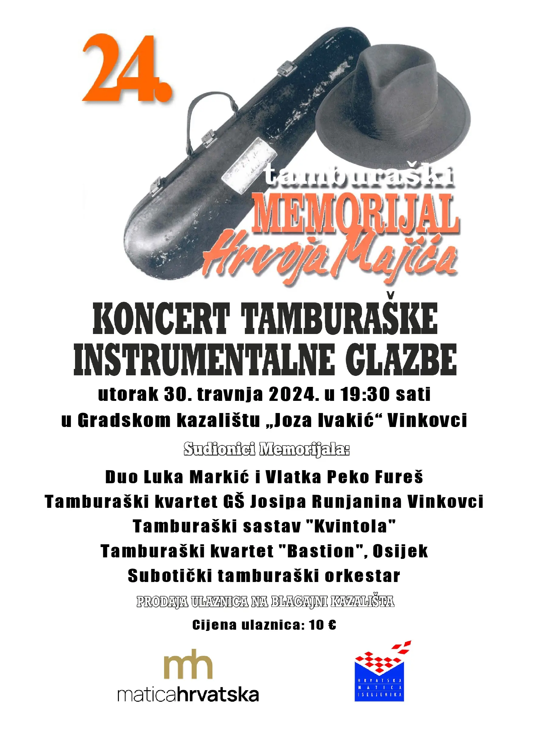 Koncert instrumentalne tamburaške glazbe održava se u vinkovačkom gradskom kazalištu "Joza Ivakić", 30. travnja u 19:30 sati